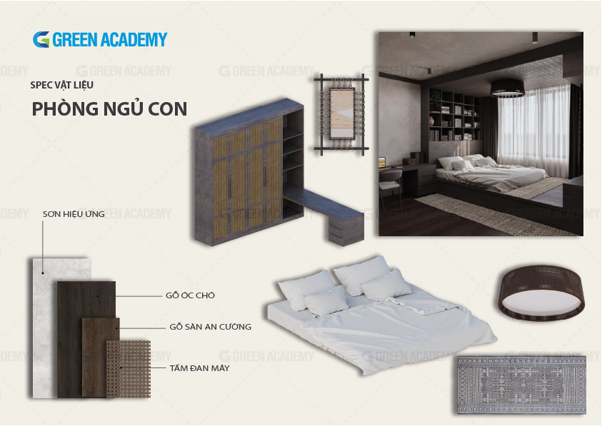 Gỗ, vải, sơn hiệu ứng, đá, tấm đan mây.