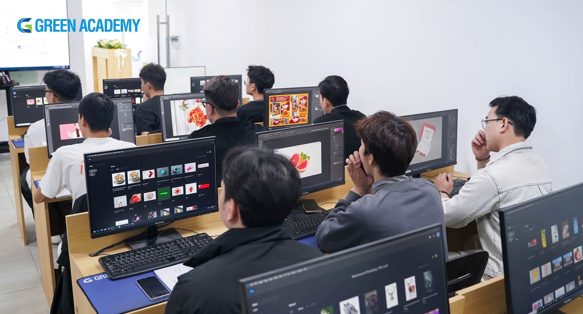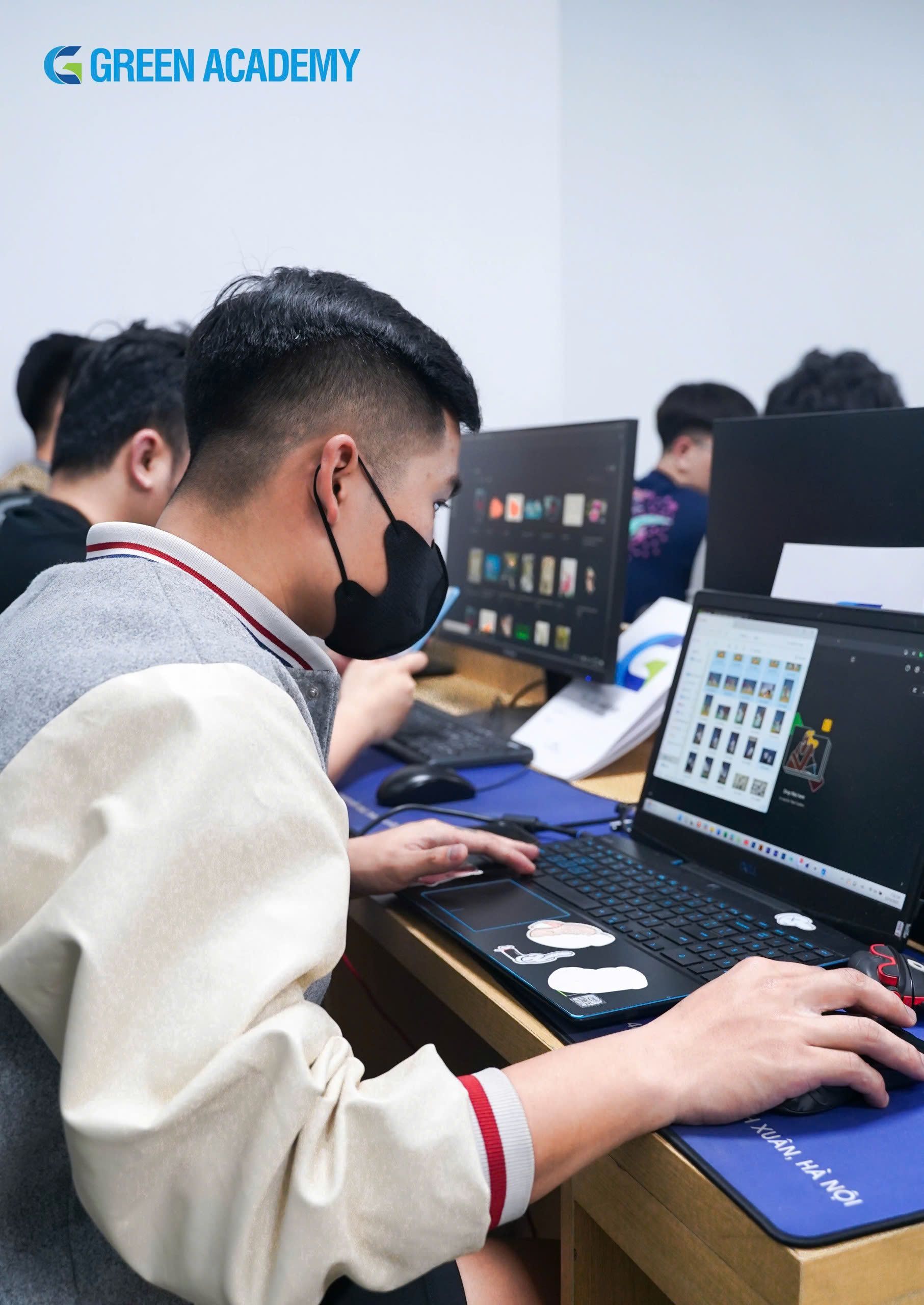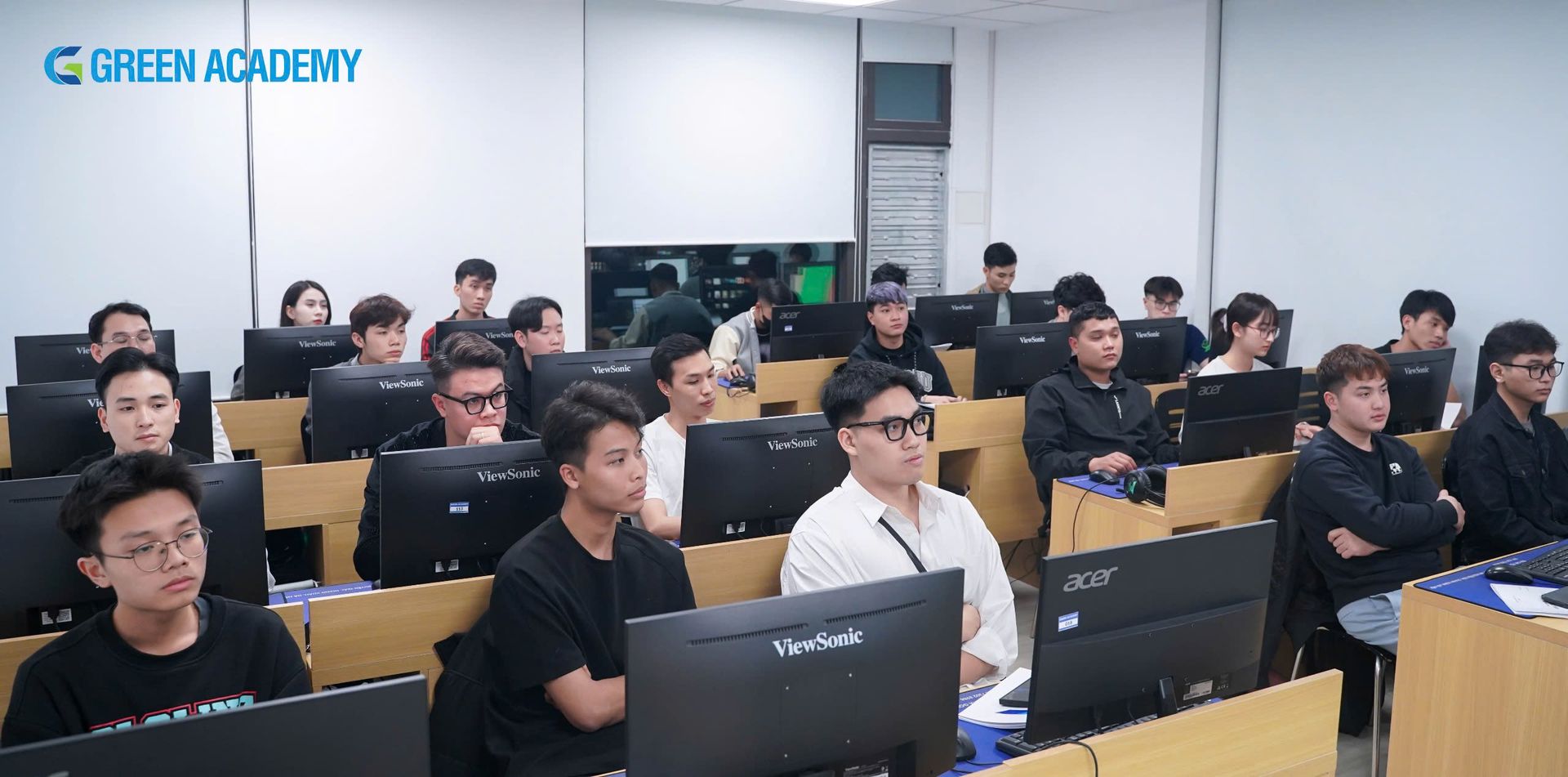 Tại Green Academy, học viên không chỉ tiếp cận kiến thức bài bản mà còn thực hiện 100% ngay trên dự án thực tế. Giảng viên không chỉ là thầy dạy mà còn là những chuyên gia trực tiếp làm nghề, giúp học viên nắm chắc kỹ năng thực tế ngay từ trong lớp học.