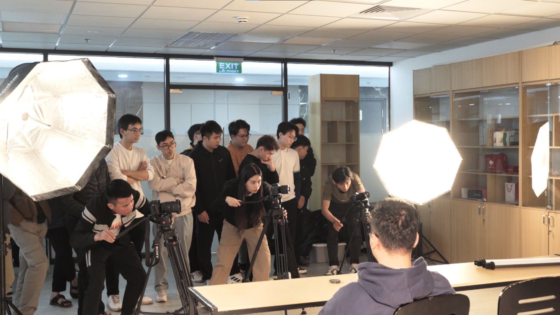 Thực hành trong studio chuyên nghiệp với sự hỗ trợ từ các thiết bị hiện đại như đèn studio, gimbal và máy quay chuyên dụng.