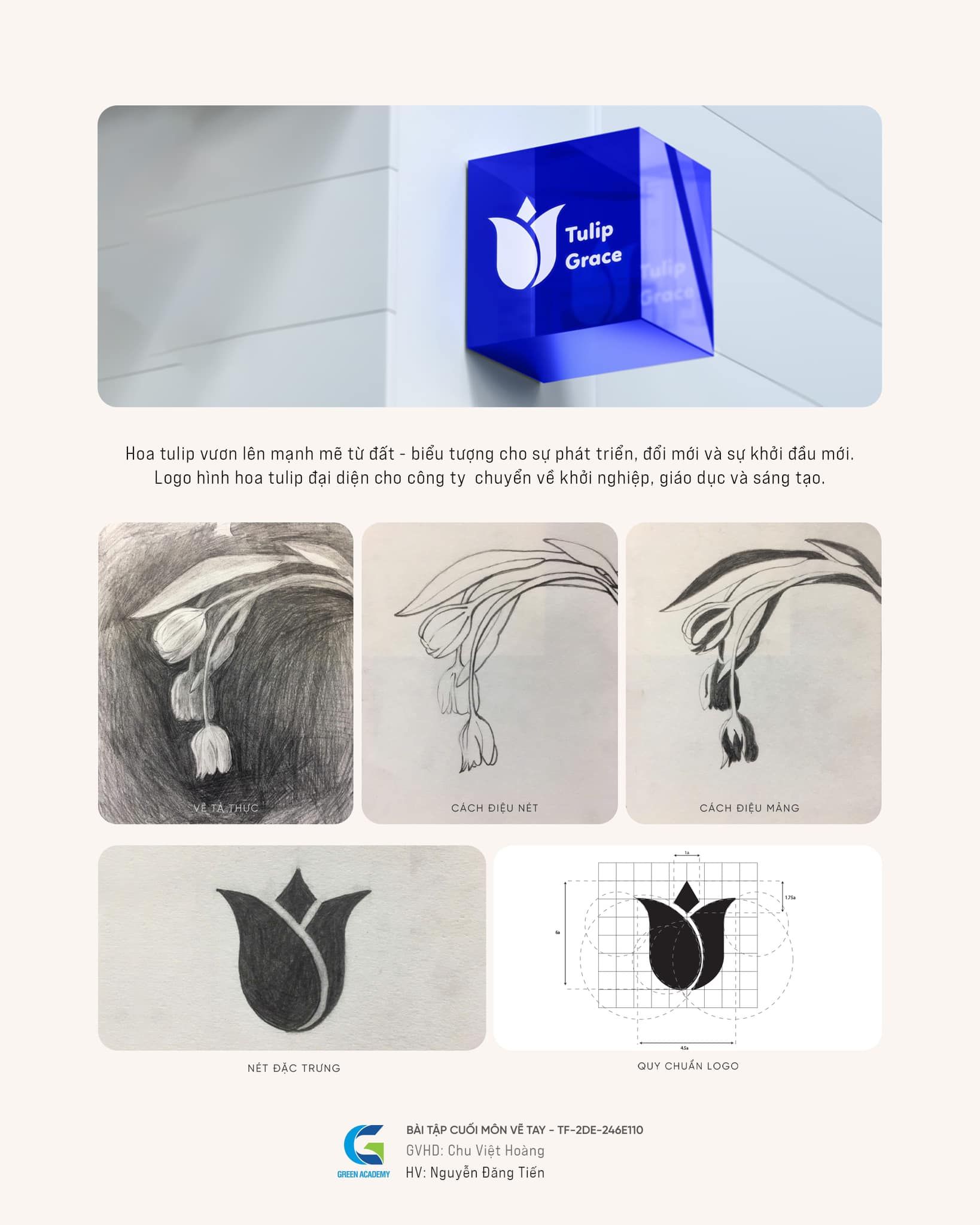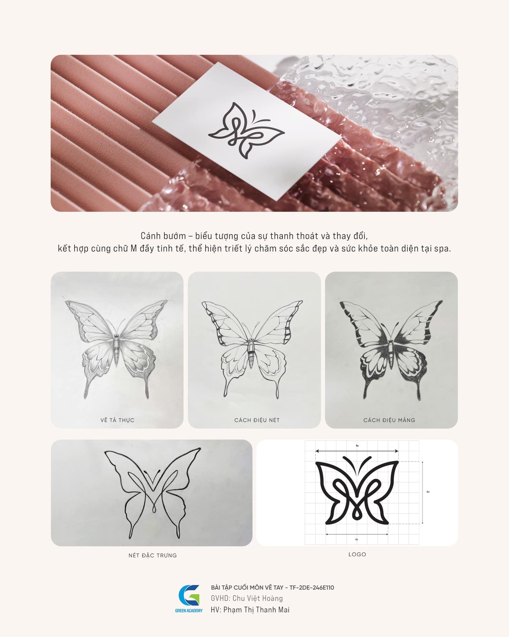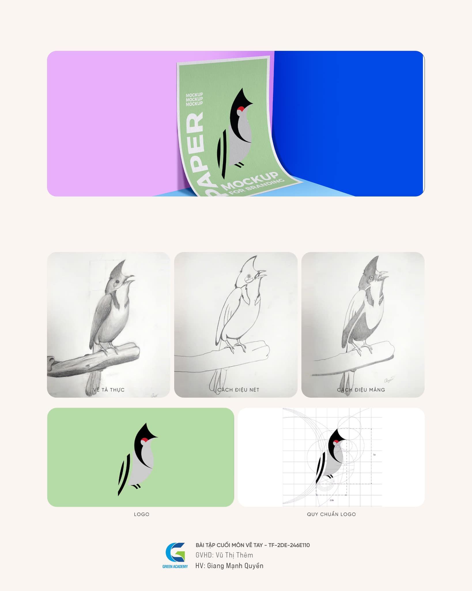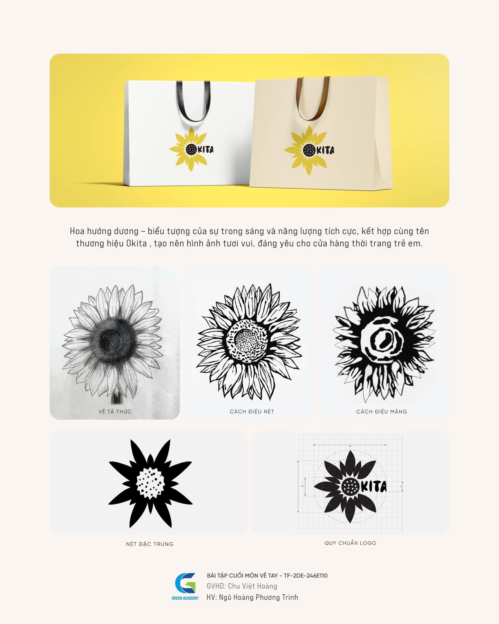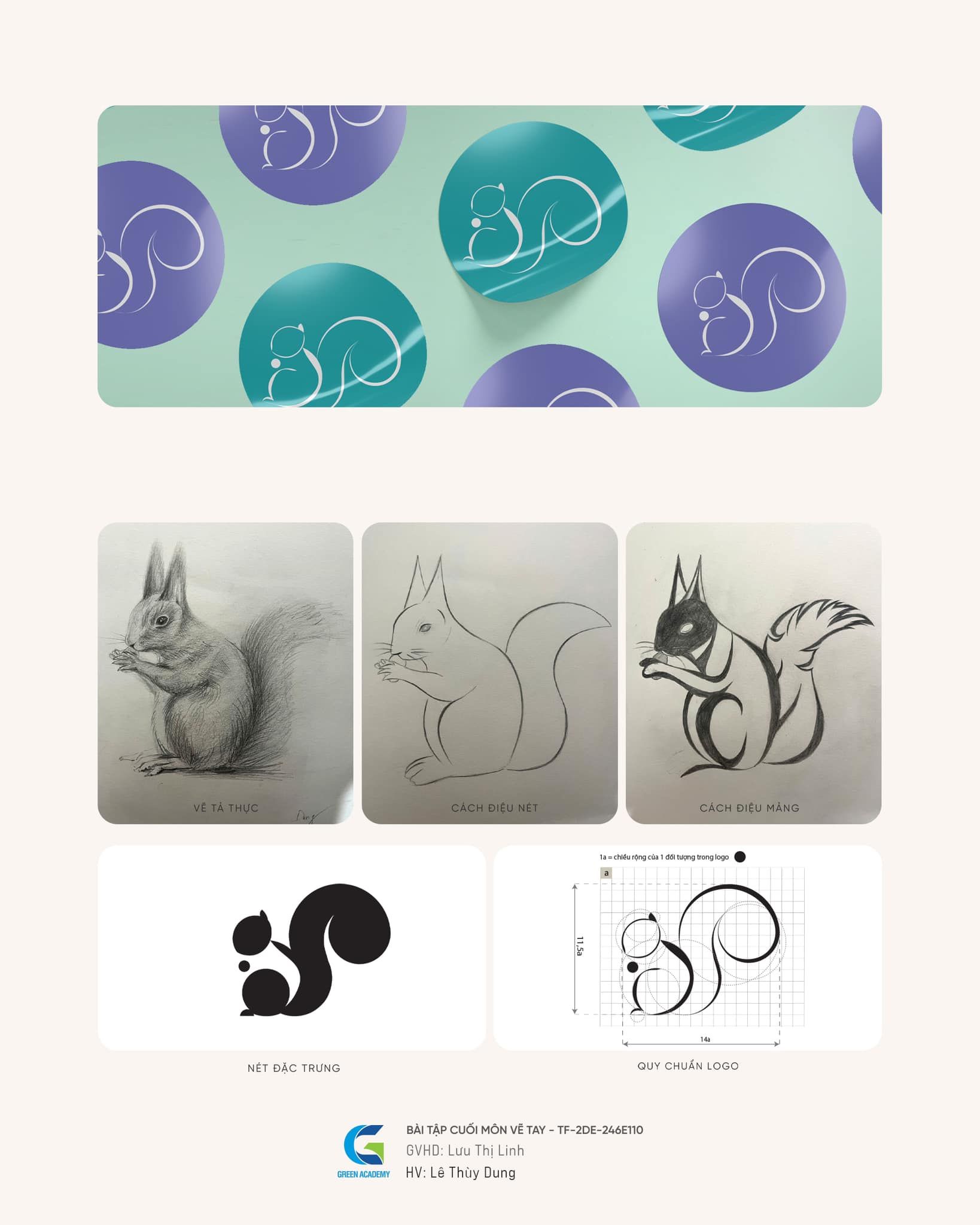 Điểm đặc biệt trong đồ án lần này là học viên được lựa chọn một đối tượng thực tế để quan sát, nghiên cứu và phát triển dần qua các bước: vẽ tả thực – cách điệu nét – cách điệu mảng – phát triển nét đặc trưng – tạo hình logo – quy chuẩn lưới thiết kế.