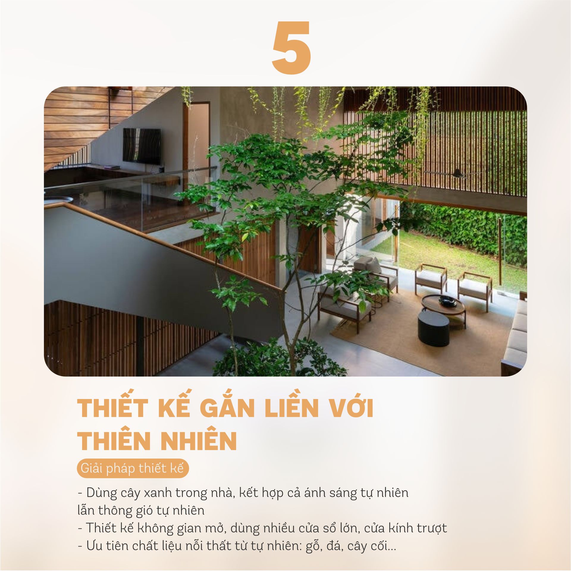 Sử dụng cây xanh trong nhà, làm sáng tự nhiên và vật liệu gỗ, đá tự nhiên.