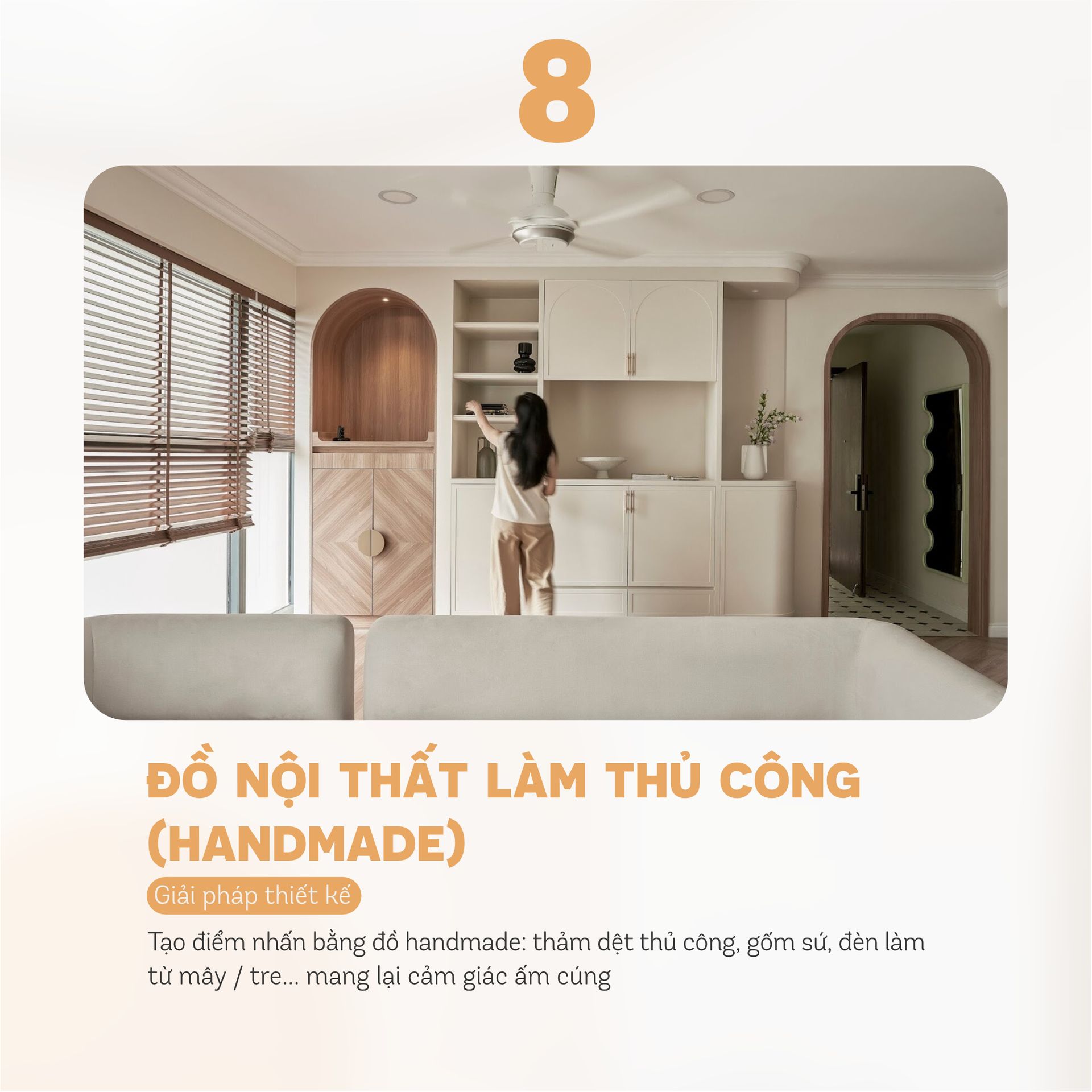 – Tạo điểm nhấn bằng đồ handmade: thảm dệt thủ công, gốm sứ, đèn làm từ mây / tre… mang lại cảm giác ấm cúng.