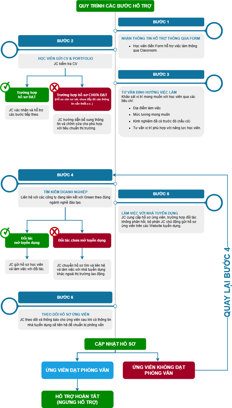 3. Các bước hỗ trợ tìm việc (Đối với Học viên lớp SẮP KẾT THÚC và đủ điều kiện hỗ trợ việc làm)