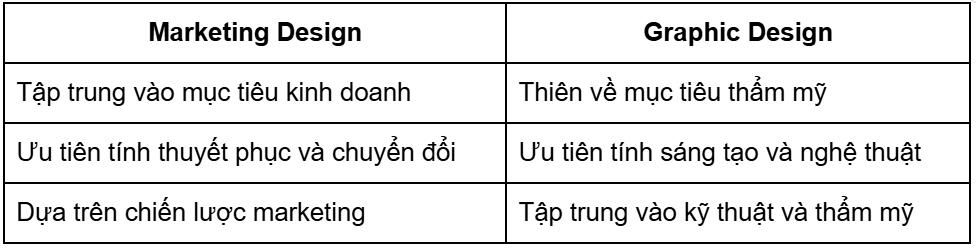Marketing Design tích hợp chiến lược marketing vào quá trình thiết kế, trong khi Graphic Design thuần túy tập trung vào yếu tố thẩm mỹ và kỹ thuật. Một người được đào tạo làm designer cần hiểu rõ sự khác biệt này để tạo ra sản phẩm đáp ứng mục tiêu marketing.