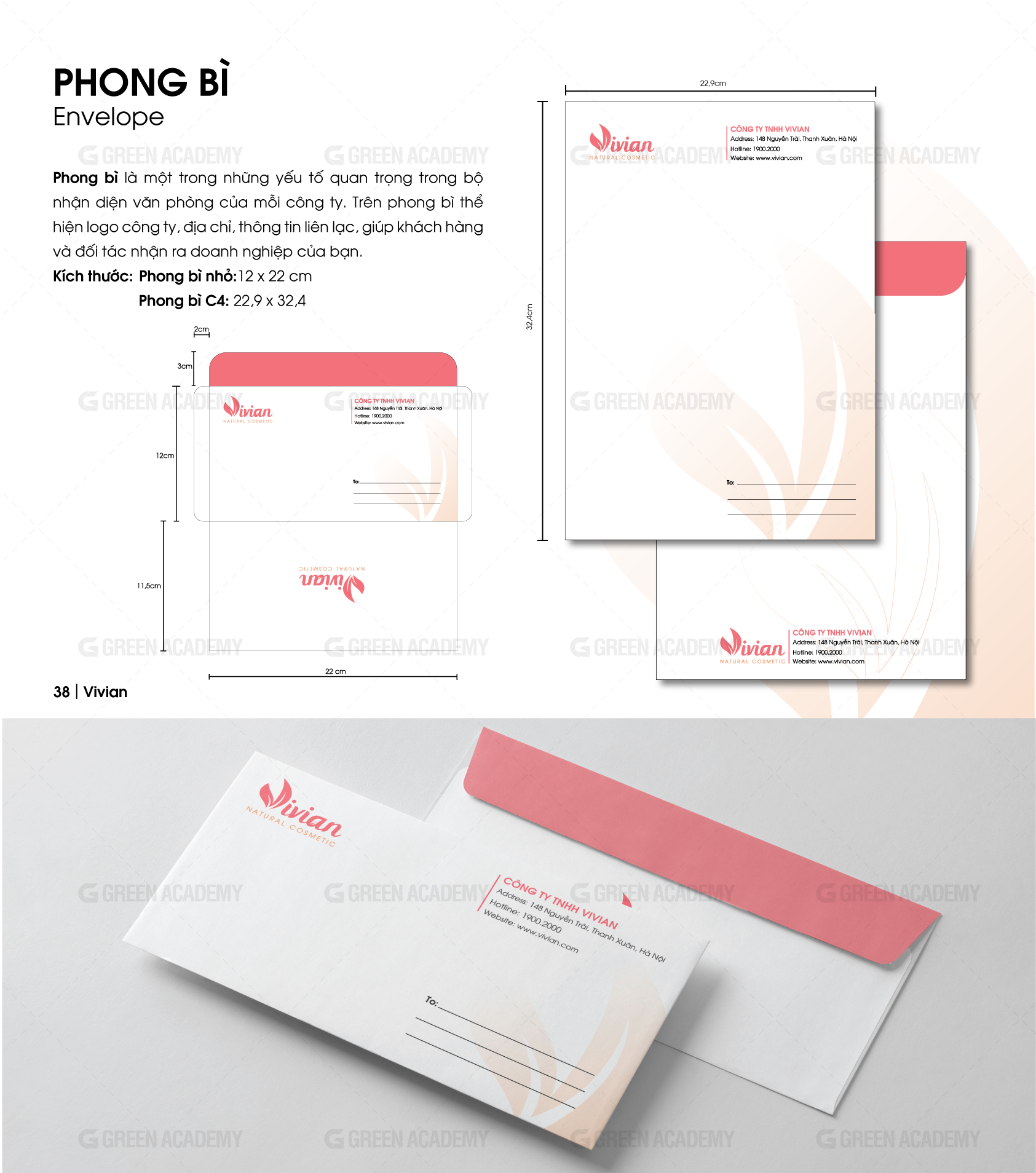 Vivian ghi điểm với bộ ấn phẩm văn phòng được thiết kế đồng bộ và khoa học: từ danh thiếp, giấy viết thư, phong bì, folder, đến thẻ nhân viên – tất cả đều tuân thủ nghiêm ngặt lưới bố cục và quy chuẩn hiển thị logo. Điều này giúp thương hiệu duy trì hình ảnh chuyên nghiệp trong mọi tương tác.