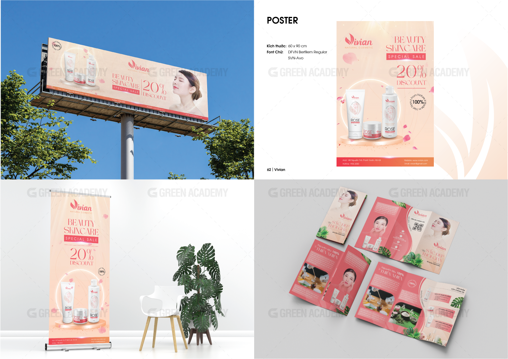 Bên cạnh đó, bộ ấn phẩm truyền thông (poster, banner, brochure, standee, social post…) thể hiện sự đầu tư về mặt hình ảnh: sáng rõ, nữ tính, bắt trend nhưng không quá rối mắt. Đây là một trong những điểm mạnh nổi bật của đồ án Vivian so với các dự án cùng ngành.
