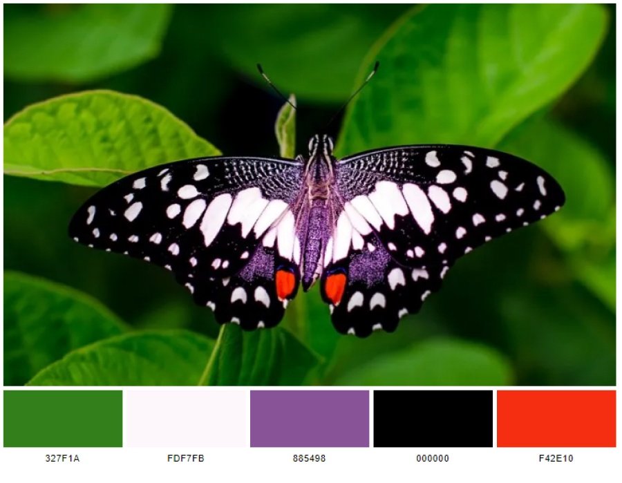 tạo ra nguồn cảm hứng cho bảng màu gồm 5 màu chủ đạo: web forest green (327f1a), snow (fdf7fb), French lilac (885498), black (000000) và RYB red (f42e10).