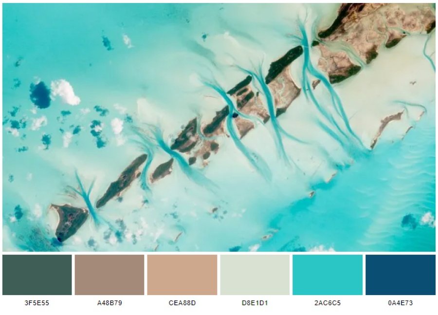 Color scheme lấy cảm hứng từ bức ảnh Bahamas gồm có 6 màu: feldgrau (3f5e55), beaver (a48b79), tan (cea88d), timberwolf (d8e1d1), maximum blue green (2ac6c5) và dark cerulean (0a4e73).