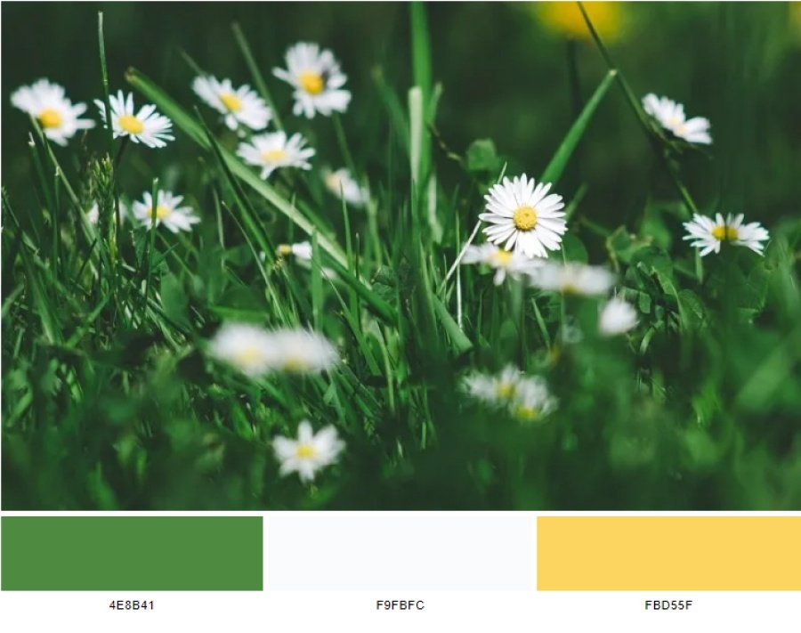 là nguồn cảm hứng sáng tạo ra color scheme với ba màu: may green (4e8b41), ghost white (f9fbfc) và naples yellow (fbd55f).