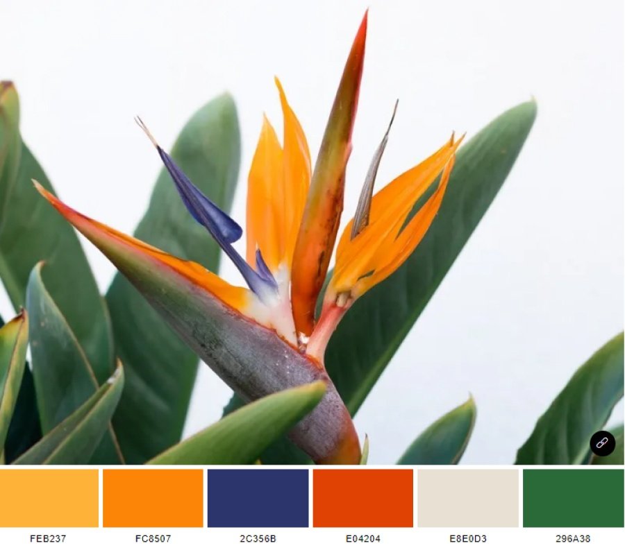 color scheme lấy cảm hứng từ bức ảnh Bird of paradise cũng bao gồm 6 màu chủ đạo: yellow orange (feb237), american orange (fc8507), deep koamaru (2c356b), sinopia (e04204), white coffee (e8e0d3) và Japanese laurel (296a38).