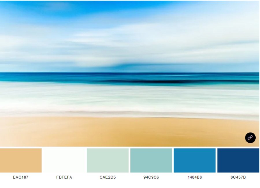 gồm có 6 màu: crayola’s gold (eac187), baby powder (fbfefa), columbia blue (cae2d5), middle blue green (94c9c6), cyan cornflower blue (1484b8) và dark cerulean (0c457b). đây là bảng màu lấy cảm hứng từ bức ảnh thiên nhiên “Seashore Skyline”.