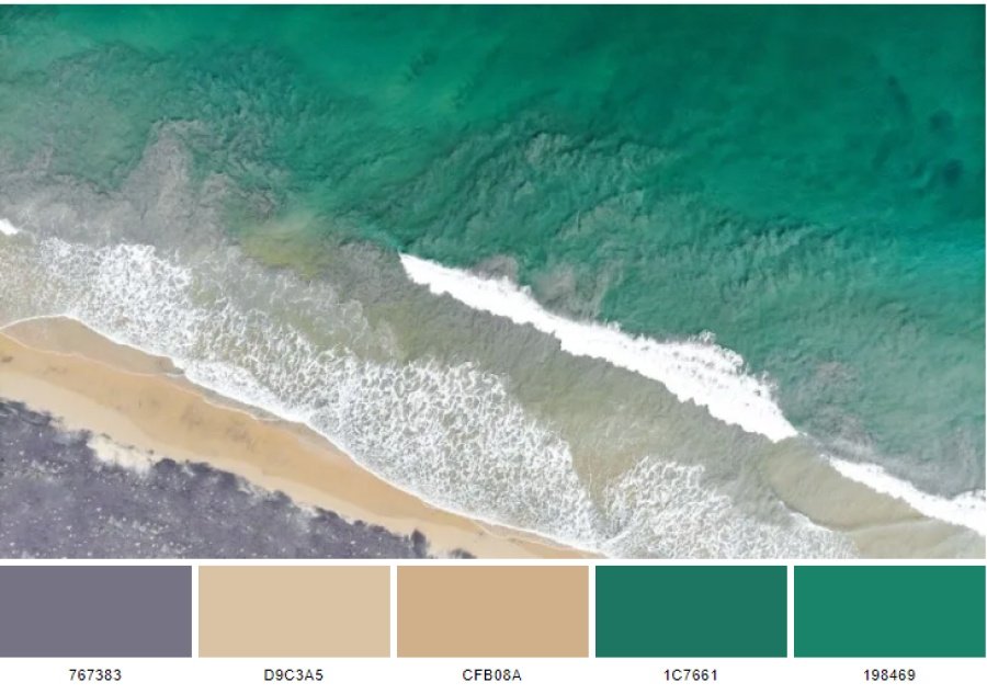 bảng màu được lấy cảm hứng từ “Green beach” bao gồm 5 màu: sonic silver (767383), dark vanilla (d9c3a5), tan (cfb08a), deep green-cyan turquoise (1c7661) và deep green-cyan turquoise (198469).