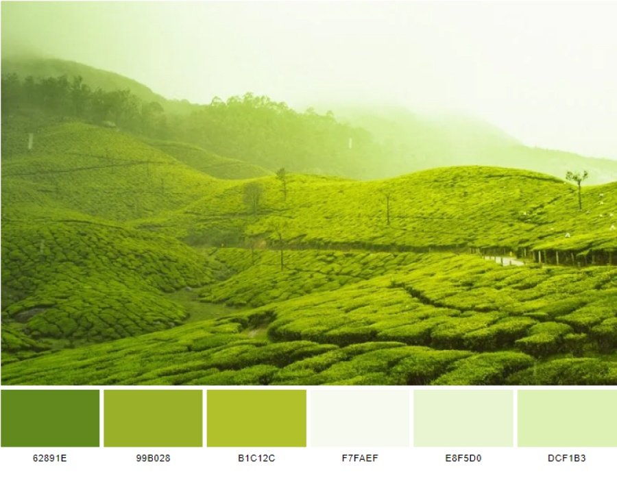 tạo nên cảm hứng cho color scheme với 6 màu: olive drab #3 (62891e), citron (999b028), acid green (b1c12c), cultured (f7faef), eggshell (e8f5d0) và tea green (dcf1b3).