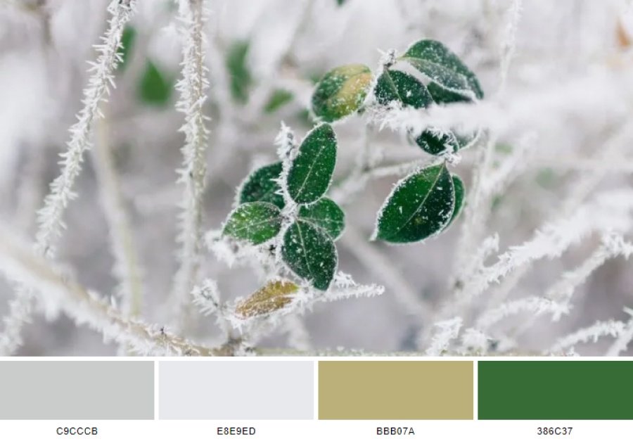 bảng màu này gồm 4 màu chính: Chinese silver (c9cccb), bright gray (e8e9ed), misty moss (bbb07a) và Japanese laurel (386c37).