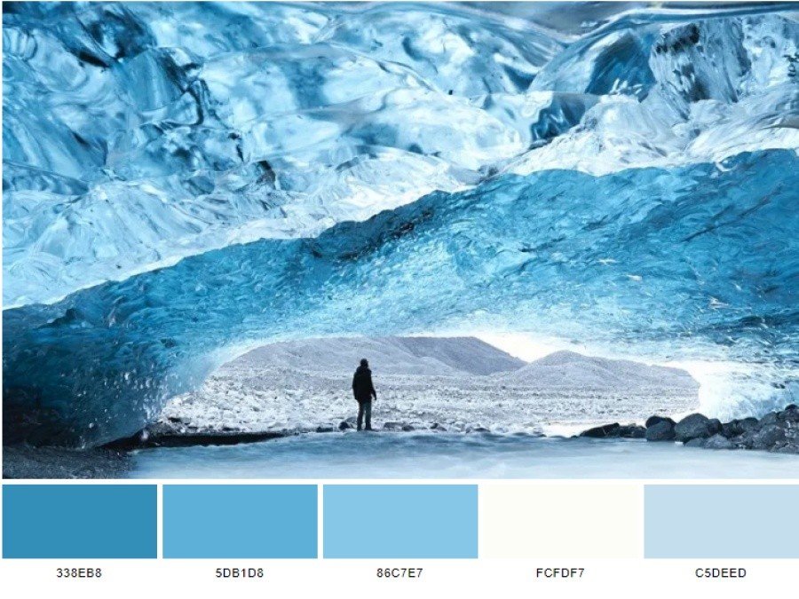 là cảm hứng tạo ra color scheme với 5 màu: steel blue (338eb8), carolina blue (5db1d8), sky blue (86c7e7), milk (fcfdf7) và Columbia blue (c5deed).