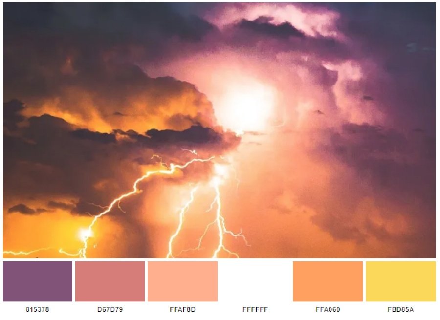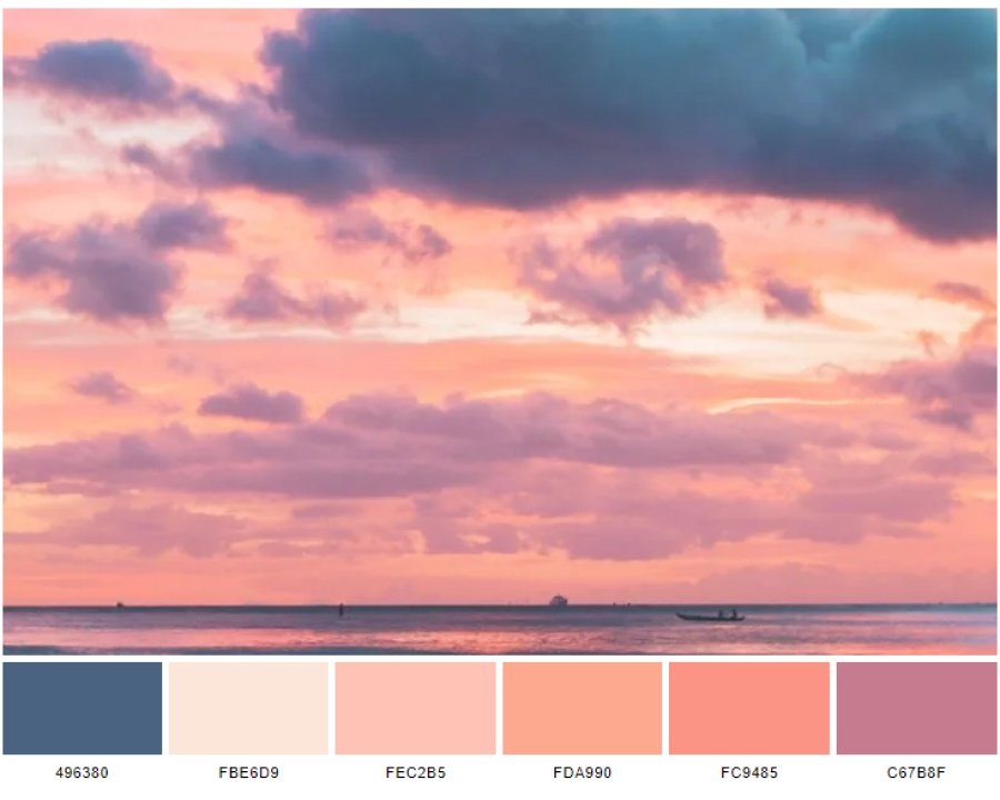 Color scheme lấy cảm hứng từ bức ảnh Another sunset gồm 6 màu chủ đạo: dark electric blue (496380), antique white (FBE6D9), melon (FEC2B5), vivid tangerine (FDA990), vivid tangerine (FC9485) và charm (C67B8F).